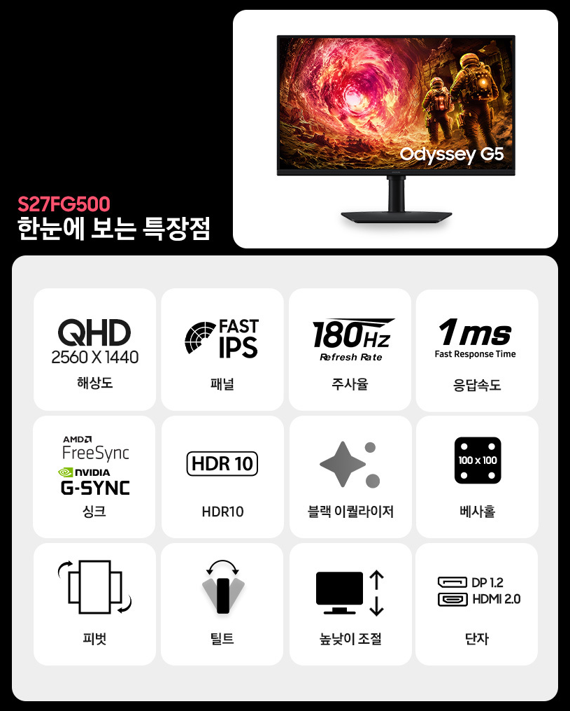 게이밍 모니터 추천, 삼성전자 오디세이 G5 LS27FG500 68~69cm(27인치) IPS QHD 180Hz 모니터