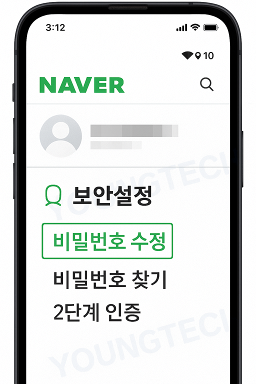 ➡ 모바일은 네이버 앱 → 왼쪽 상단 메뉴(☰) → 본인 프로필 클릭 → 보안설정 → 비밀번호 수정에서, PC는 네이버 홈페이지 → 우측 상단 ID 클릭 → 내 정보 → 보안설정에서 찾을 수 있어요.