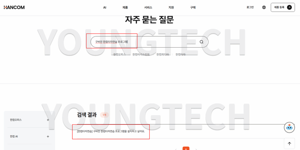 2. 홈페이지 혹은 지원 → 자주 묻는 질문 메뉴에서 “구버전 한컴타자연습 프로그램”을 검색합니다.