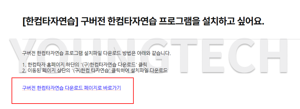 3. "구버전 한컴타자연습 프로그램을 설치하고 싶어요.”를 누르고, "구버전 한컴타자연습 다운로드 페이지 바로가가"를 눌러 구버전 설치 페이지로 이동합니다.