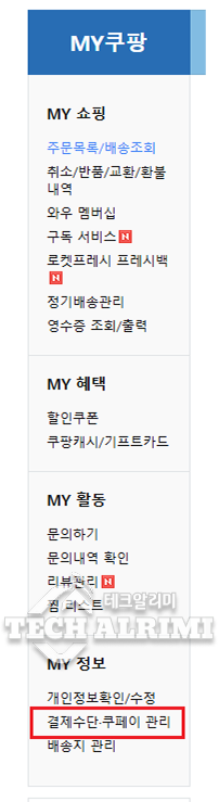 2. 하단의 '결제수단ㆍ쿠페이 관리'를 눌러요